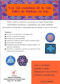 El Sábado 11 de Agosto de 2012 dará comienzo el Taller de Mandalas dictado por LucÃa Moncayo. El mismo tendrá una duración de 2 clases, sábados de 11:30 a 13:30 hs.