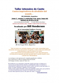 Los dÃas Lunes 2, Martes 3 y Miércoles 4 de Mayo de 2011 se dictará un Taller de Canto, a cargo de Bill Henderson. El costo es de 30 pesos, cada dÃa. Se trabajará sin partituras, sin instrumentos y con músicas del mundo, maorÃ, africana, etc. El taller tendrá lugar en la Escuela Las Lengas, Chubut y Santa Cruz, de 18:00 hs. a 21:30 hs.
