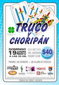 El Domingo 19 de Agosto de 2012 se realizará el evento "Truco y Choripán", cuyo premio será un cordero mas un cajón de cerveza. El valor por pareja es de 40 pesos. El mismo tendrá lugar en el Quincho del Ushuaia Rugby Club a las 20:00 hs.
