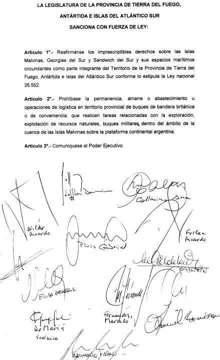Artículo 1º.- Reafirmanse los imprescriptibles derechos sobre las Islas Malvinas, Georgias del Sur y Sandwich del Sur y sus espacios marítimos circundantes como parte integrante del territorio de la provincia de Tierra del Fuego, Antártida e Islas del Atlántico Sur conforme lo estipula la Ley nacional 26.552.