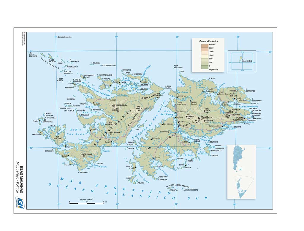 El mapa físico político escolar de relieve oficial de las islas Malvinas es provisto por el IGN -Instituto Geográfico Nacional- y puede ser descargado aquí.