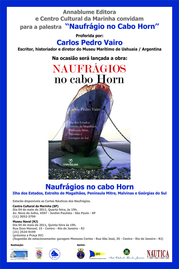 El libro Naufrágios no cabo Horn, Ilha dos Estados, Estreito de Magalhaes, Península Mitre, Malvinas e Geórgias do Sul fue escrito por el Licenciado Carlos Pedro Vairo y editado por Annablume Editora en 2010 -368 páginas, formato 16 x 23 cm.-