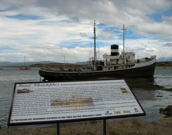 Se llamaba Justice cuando fue comprado en 1947 por Leopoldo Simoncini propietario de la firma Salvamar. Simoncini lo bautizó Saint Christopher y lo destinó en 1953 al trabajo de salvataje del paquebote Monte Cervantes que se hallaba encallado en el Canal Beagle desde el año 1930. El rescate fue infructuoso y terminó con el hundimiento del Monte Cervantes. Luego la firma entró en quiebra y el Saint Christopher por problemas mecánicos y del timón nunca más abandonó Ushuaia. En Enero de 1957 fue varado en su ubicación actual a escasos metros de la costa frente a la ciudad.