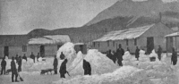 Y agrega "Pocos años se recuerdan de fríos más intensos y de más crudas nevazones. Lo ganados han sufrido extraordinariamente, y si bien no han muerto tantos como el año anterior, ha sido debido a los cuidados de los pobladores, que esta vez adoptaron precauciones especiales, almacenando forrajes y construyendo abrigos y reparos para sus animales. El úlltimo viaje que realizó el transparte nacional «Santa Cruz», que manda el capitán de fragata Mascarello, ex comandante del «Azopardo» y uno de los jefes de marina más conocedores de los mares australes, fué de verdadera prueba. En la noche del 21 de Julio el barco se hallaba en los canales de Beagle, habiendo concluido la obra de elevar una cruz en la Isla Gable, donde naufragó el bote del "Almirante Brown" que montaba el alférez Mackinlay con cuatro compañeros y por poco la nieve no produjo una catástrofe. En nuestro grabado puede verse cuánta fué su cantidad, llegando a haber en cubierta casi un medio metro y otro tanto el día que el barco entró á Punta Arenas. Un temporal excepcional tenia a la población recluida en el interior de las casas y cuando el barco fondeó en el puerto la ciudad chilena parecía muerta, Las casas, sus calles y sus campos se hallaban cubiertos por un espeso manto de nieve. El jefe de la cárcel de reincidentes en Tierra del Fuego, sacó una vista de Ushuaia en esos dias, y de la cascada del Rio Grande, que son las que reproducen nuestros grabados y por ellas puede juzgarse de lo que ha sido el invierno en la región austral. Dice el señor Cortez que en los quince años que hace reside en Tierra del Fuego, no ha visto dias más espantosos ni temporales más bravos. Las cascadas y los ríos correntosos se helaron y ha habido momentos en que no había más agua potable que la del hielo derretido en recipientes colocados en las cocinas. El «Santa Cruz» se detuvo en la Isla Gable y allí levantaron los tripulantes, bajo las órdenes del segundo del barco, alférez de navío Virgilio Moreno Vera, la cruz conmemorativa del naufragio del alférez Juan Mackinlay y de sus compañeros en la noche del 31 de Abril último, cuya colocación había encomendado el Centro Naval. La cruz contiene una inscripción con el nombre de los náufragos, que son el alférez de fragata Juan Mackinlay, cabo de mar Ramón Peña y marineros José M. Araujo, Martín López, Alejandro Flores y José Navarro. De estos náufragos, solamente se encontró un cadáver, que fué sepultado en Puerto Brown.