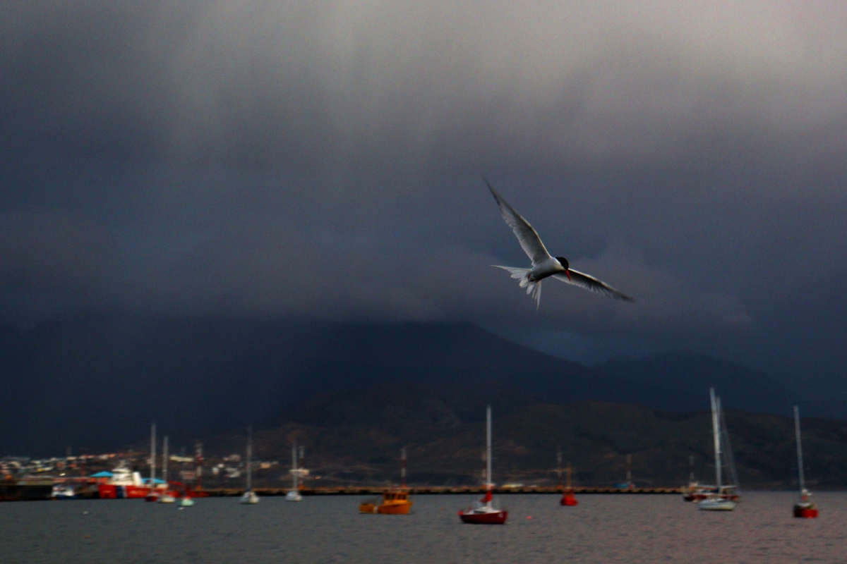 21:19 hs. Un gaviotín busca sus presas en las aguas de la bahía - Un Instante en Ushuaia - Ushuaia-Info