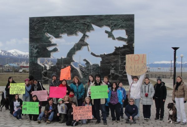 11/08/2010 - Miembros de ARAF (Amigos del Reino Animal Fueguino) se manifestaron en repudio a la matanza de perros en Neuquén, en una concentración que realizaron en el Monumento a los CaÃdos en las Islas Malvinas.