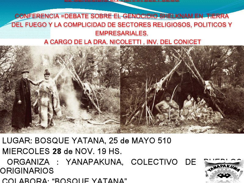 28/11/2012 - El Miércoles 28 de Noviembre de 2012 se realizará una conferencia-debate sobre el genocidio shelknam en Tierra del Fuego y la complicidad de sectores religiosos, polÃticos y empresariales.