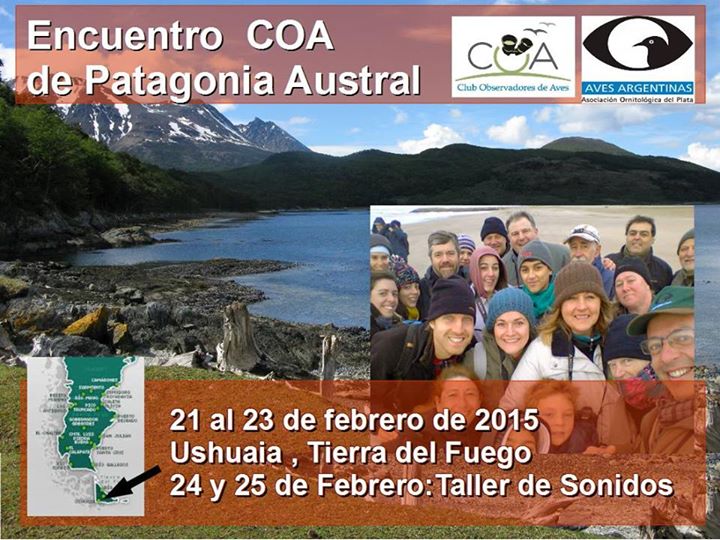 09/02/2015 - Los COA -Clubes de Observadores- se reunirán en Ushuaia del 21 al 23 de Febrero de 2015. El encuentro organizado por los COA de la Patagonia Austral incluirá actividades de trabajo e intercambio entre socios y también actividades abiertas a la comunidad. Habrá charlas con especialistas, se realizarán salidas de campo y se compartirán experiencias sobre la actividad. Como extensión del encuentro se dictará un taller especializado en Sonidos de Aves a cargo del especialista Juan Pablo Culasso.