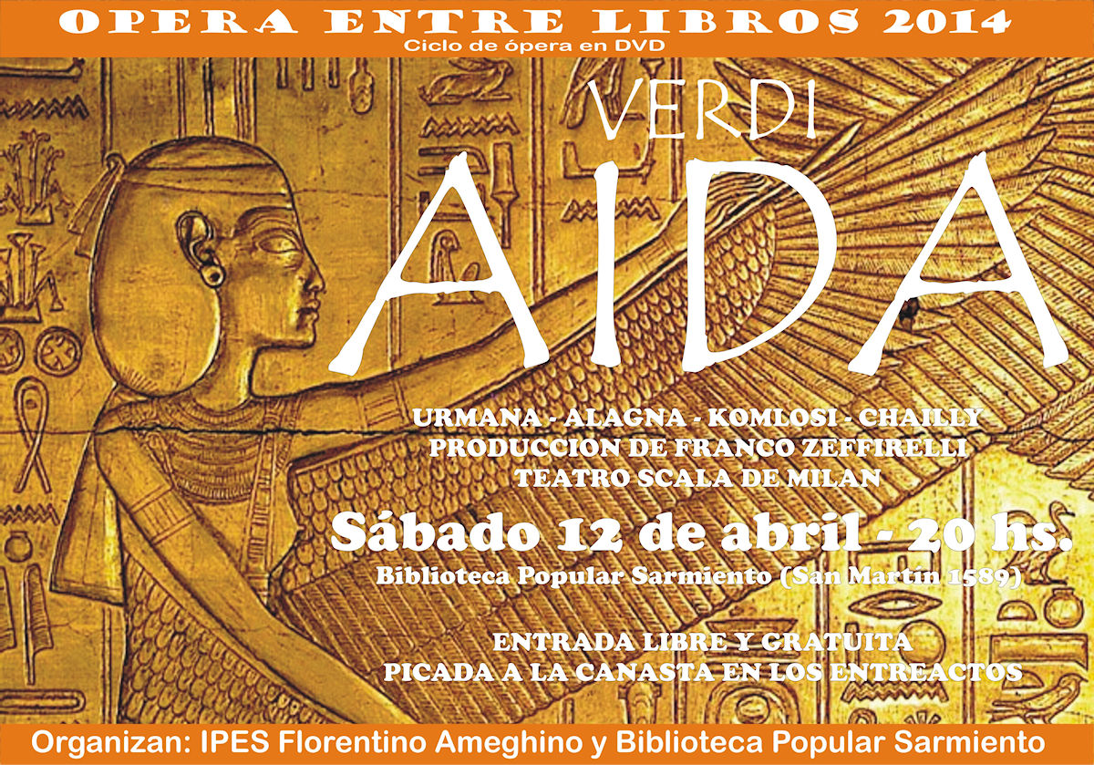 La obra elegida para el regreso es Aída de Giuseppe Verdi en una producción de Franco Zefirelli grabada en el teatro Scala de Milán. El ciclo de proyecciones de ópera en DVD es organizado por la Biblioteca Ikaukayen del IPES Florentino Ameghino en conjunto con la Biblioteca Popular Sarmiento; con la coordinación general de Walter Carabajal. Como es costumbre, en el entreacto se invitará a los asistentes a compartir una picada a la canasta. La cita es a las 20:00 hs. en la sede de la Biblioteca Sarmiento -San Martín 1589- con entrada libre y gratuita.Visitas: 4260