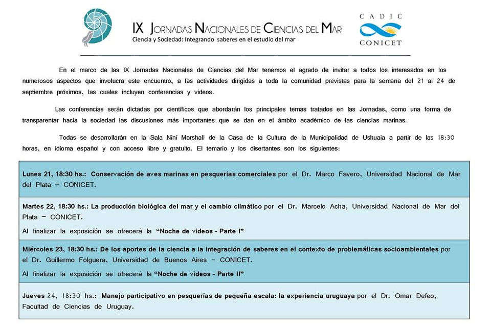 Del 21 al 24 de Septiembre de 2015 entre algunas ofertas se brindarán charlas y proyecciones de videos. De tal manera las conferencias estarán a cargo de científicos que abordarán temas tratados en las jornadas, para mostrar a la sociedad qué temas sobre las ciencias marinas se debaten en el ámbito académico. Luego de las charlas se continúa con La Noche de los videos del Mar. Las actividades son libres y gratuitas y tienen lugar en la Sala Niní Marshall de la Casa de la Cultura a partir de las 18:30 hs. Este Jueves 24 el Doctor Omar Defeo de la Facultad de Ciencias de Uruguay disertará sobre el "Manejo participativo en pesquerías de pequeña escala: la experiencia uruguaya".Visitas: 4576