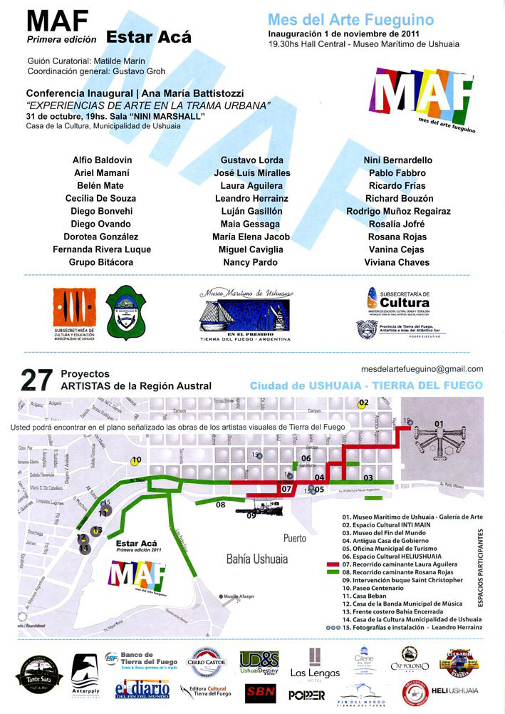 27 artistas 27 proyectos participan con el lema "Estar Acá" . Matilde MarÃn, a cargo del guión curatorial, explica que "La consigna "Estar Acá" como eje temático decide en esta primera edición explorar a través del arte la pertenencia de los artistas al lugar, la mirada sobre el paisaje circundante, su memoria, los centros urbanos crecidos al borde de la costa y sus necesidades" y en referencia a los artistas agrega "como artista aprecié mucho el compromiso de ellos con sus proyectos, la claridad conceptual, las resoluciones técnicas que fueron remediando problemas, la invención como herramienta para suplir la falta de ciertos materiales. A lo largo del año percibà el recorrido de construcción de la obra, los medios utilizados que van desde la fotografÃa, el dibujo, el objeto, la instalación, la pintura, el video, la poesÃa visual, lo tecnológico. Todo ha sido abordado" destacando además que los trabajos muestran "problemáticas que involucran lo social, el medioambiente, la historia sin clichés".