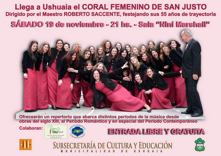 16/11/2011 - El Coro Femenino de San Justo fue creado por su director Roberto Saccente hace 55 años y continúa hoy su rica trayectoria. Finaliza este año con un Concierto Aniversario en la Sala Ninà Marshall el Sábado 19 de Noviemnre a las 21:00 hs. El repertorio que brindará recorrerá distitos perÃodos de la música y en especial el Contemporáneo.