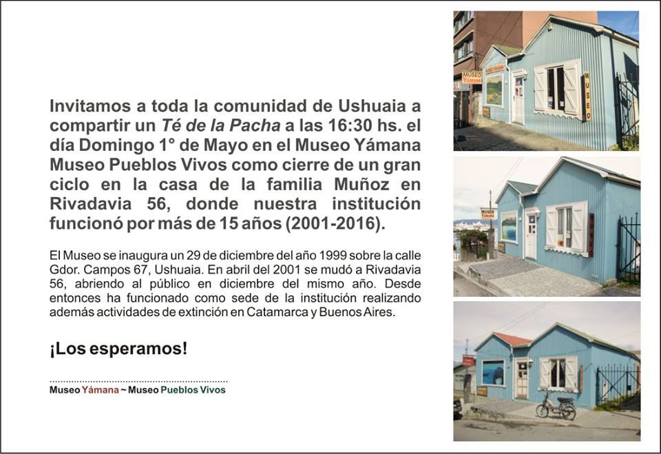 30/04/2016 - El Museo Yamana invita a la comunidad a participar el Domingo 1° de Mayo de 2016 a un Té de la Pacha que realizará como despedida de la sede que ocupa desde hace 15 años en la Rivadavia 56. El encuentro se realizará a las 16:30 hs.