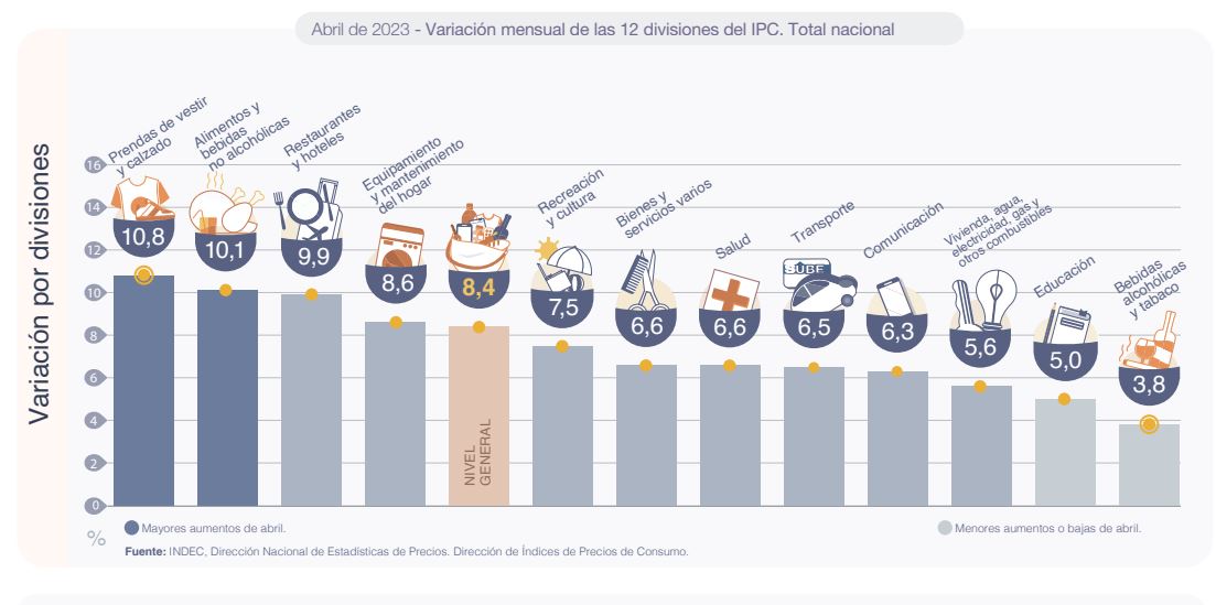 El Nivel general del Índice de precios al consumidor registró un alza mensual de 8,4% en abril de 2023, y acumuló una variación de 32,0%. En la comparación interanual, el incremento alcanzó el 108,8%. La división de mayor aumento en el mes fue Prendas de vestir y Calzado (10,8%) por cambios de temporada. Le siguió Alimentos y bebidas no alcohólicas (10,1%), con los incrementos más altos en Verduras, tubérculos y legumbres; Leche, productos lácteos y huevos; Azúcar, dulces, chocolates, golosinas, etc. y Carnes y derivados. También se destacaron las subas de las divisiones Restaurantes y hoteles (9,9%); y Equipamiento y mantenimiento del hogar (8,6%). El aumento de Alimentos y bebidas no alcohólicas (10,1%) fue el que más incidió en todas las regiones. Al interior de la división, impactó la suba de Carnes y derivados, y de Verduras, tubérculos y legumbres, seguidas por Leche, productos lácteos y huevos; y nalmente Pan y Cereales. Las dos divisiones de menor variación en abril fueron Educación (5,0%) y Bebidas alcohólicas y tabaco (3,8%). A nivel de las categorías, Estacionales lideró el aumento (12,6%) seguida por el IPC Núcleo (8,4%); en tanto que los Regulados registraron un incremento de 4,9%.