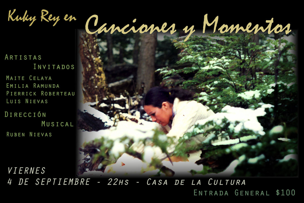 27/08/2015 - La cantante Kuky Rey presentará el Viernes 4 de Septiembre de 2015 el espectáculo "Canciones y Momentos" en el que estará acompañada por los artistas invitados Maite Celaya, Emilia Ramunda, Pierrick Roberteau y Luis Nievas. La dirección musical del show estará a cargo de Rubén Nievas. El recital se llevará a cabo en la Casa de la Cultura a las 22:00 hs. y el valor de la entrada general es de 100 pesos.