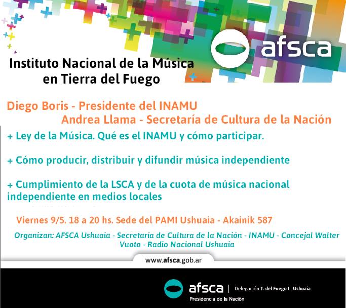 En el encuentro al que se convoca a todos los músicos de la ciudad se informará sobre como producir, distribuir y difundir la música independiente. Los conferencistas son Diego Boris -Presidente del INAMU- y Andrea Llama -de la Secretaría de Cultura de la Nación-. La intención es plantear las necesidades de la música que se produce en forma independiente y avanzar en el cumplimiento de la ley de servicios de comunicación audiovisual y la cuota de contenidos de música nacional independiente en los medios. También se detallarán los derechos intelectuales en la Música y se presentará el primer manual del INAMU. La charla se realizará de 18:00 a 20:00 hs. en la Sede del PAMI Ushuaia -Akainik 587-.Visitas: 4042