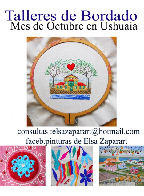 El taller constará de tres encuentros a partir del 9 de Octubre; en cada jornada se verá una técnica diferente comenzando por lo básico y pasando por el bordado contemporáneo, el bordado Chino o ruso y el bordado mexicano. Quienes estén interesados en inscribirse al taller pueden contactarse a través a través del perfil en facebook o escribiendo al e-mail elsazaparart@hotmail.com Más allá de que la artista haya vuelto a vivir en el Norte, su obra permanece en varios sectores de la ciudad a través de los carteles en madera con pinturas de estilo naif que realizó durante años, siendo el más notorio el que se emplaza en el paso costero en el sector del puerto, frente al que cada año miles de turistas se fotografían transformándolo en un elemento icónico de la ciudad. Charlamos brevemente con Elsa para conocer un poco más sobre su relación con Ushuaia "vivi 27 años en Ushuaia, mi hijo nació alli, construí mi propia casa, construí una familia de amigos, desarrolllé con libertad mi lado creativo, sentí la aprobación de muchísima gente que me dio trabajo de carteles durante años, que iba a las exposiciones y disfrutaban de mis pinturas, que me acompañaron desde un lugar muy positivo" expresó. Y agregó "siento que es mi lugar en el mundo, vaya donde vaya, siento que soy una turista temporaria disfrutando de otros lugares. Siempre vuelvo a pintar las casitas de chapa de Ushuaia" confesó, y expresó que "pese a toda la degradación y el descuido humano, la naturaleza a Ushuaia le da un marco de tan poderosa belleza que la salva". "Esto me fascina y renueva el amor hacia ese lugar" detalló Elsa, y resaltó de Ushuaia "la intensidad de su belleza natural", expresando que "necesitaba salir, para poder volver, con ganas, renovada, con otra mirada del lugar y de mi misma". Sobre los típicos carteles en madera que creó durante años, Elsa contó que "los carteles para mí fueron tan importantes como las pinturas, así los siento. Cada uno de ellos es un desafío creativo para lograr algo agradable y armónico con la belleza del lugar. Y asi surgieron, y la gente los aprueba y disfruta" destacó. "A los carteles un poco se los fue llevando el tiempo y el avance de otro tipo de publicidad urbana, al no haber legislación todo vale, cada uno aplica su propia estética, coincida o no con la esencia y la identidad regional" analizó; "sin embargo, algunas personas -sobre todo los dueños de lugares clásicos e históricos de Ushuaia relacionados con actividades turísticas- siguen insistiendo en preservar un estilo de cartel que tenga mas relacion con la identidad del lugar y me llaman para que diseñe". Sobre su obra más popular expresó "el cartel del puerto, de "Ushuaia Fin del Mundo" lo rehice muchas veces, la última vez, estaba tan roto que lo cargué en el auto y me lo llevé a mi casa". Y contó que "los mismos turistas lo reclamaron a una guía de turismo, buscaban el cartel de las casitas para la foto. Y me llamaron de la Municipalidad para que lo rehiciera y ahí está, ya hace 5 años de esto". El cartel se mantiene firme y sigue siendo un protagonista de las fotos de todos los turistas que transitan por la zona, pero el paso del tiempo y especialmente de los inviernos se hizo sentir en su integridad. Elsa evaluó que "los turistas ven en ese cartel un valor estético y amoroso que lamentablemente las autoridades de los entes oficiales no ven, o no valoran. Si está ahí bien, y si no no importa" y detalló que en su viaje de Octubre va a gestionar una renovación del cartel, esperando contar con el visto bueno de las autoridades. "Me da mucha satisfaccion y alegria saber que muchas personas eligieron esos carteles para identificar su lugar, y por eso les estoy muy agradecida siempre. Y ni hablar cuando veo a turistas de todo el mundo sacarse fotos al lado del cartel, eso es pura alegría". Respecto de su actualidad artística Elsa detalló sus últimas actividades "estoy exponiendo en el Museo De Arte Popular Jose Hernandez de CABA y fui seleccionada con dos obras para el XI Salon de Arte Textil". La pasión artística de Elsa se ha volcado en los últimos tiempos al arte textil contemporáneo, "estoy incursionando y aprendiendo técnicas; sigo pintando y ahora bordando, estampando, buscando nuevos lenguajes". Finalmente expresó "en Octubre voy a dar talleres de bordado contemporáneo en Ushuaia" y detalló "por ahora será así mi relación con Ushuaia, de ir y venir".