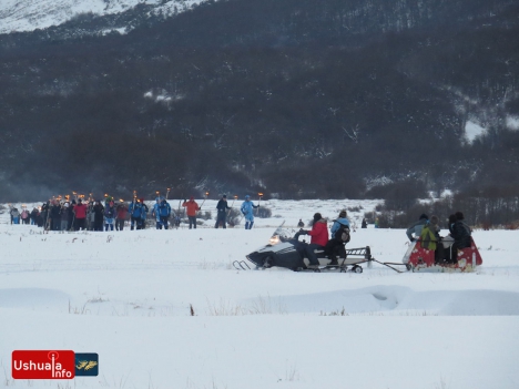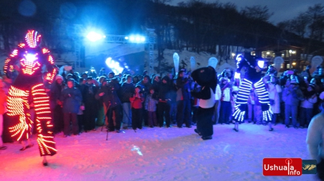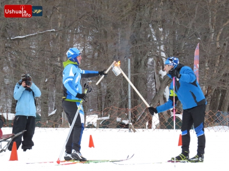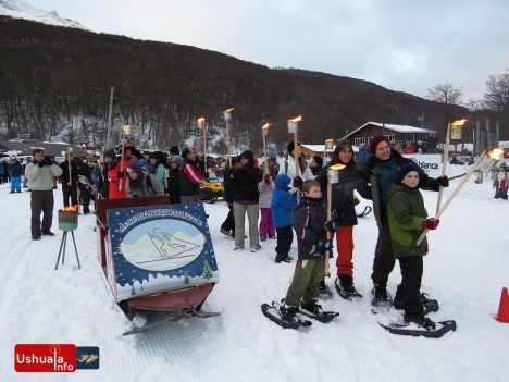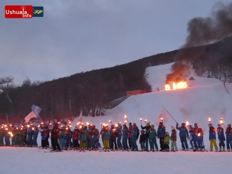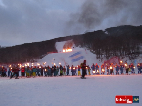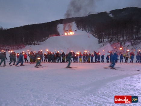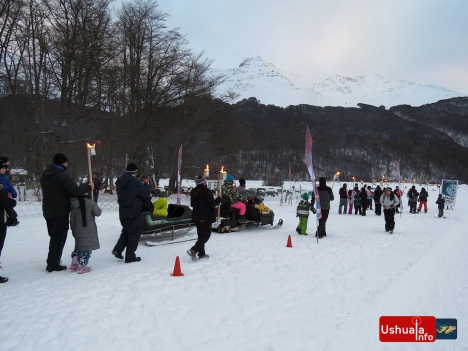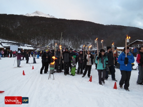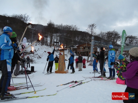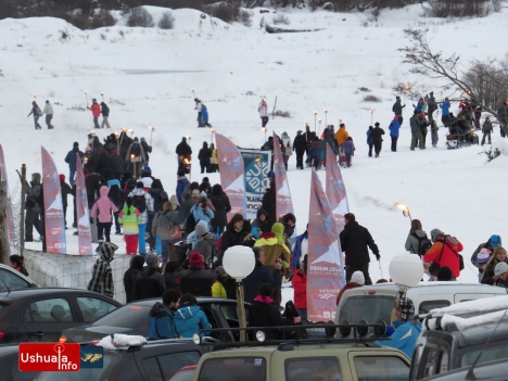 A las 15:30 hs. comenzaron los preparativos en Ushuaia Blanca, el centro de esquí de Las Cotorras desde donde partió la travesía de antorchas hacia el Cerro Castor. Fueguinos y visitantes coincidieron en el lugar, estimulados por las fuertes nevadas que recibió Ushuaia en la última semana. Con la animación de Carolina Masdeu, la marcha comenzó a las 17:20 hs. con los esquiadores encendiendo las antorchas mientras se lanzaban a recorrer los dos kilómetros que separan a Las Cotorras del Cerro Castor. Mientras tanto en la base del cerro, el grupo de rock Vozenoff realizaba una performance de tres canciones frente a un multitudinario público que esperaba ansioso la llegada de las antorchas. A las 17:45 hs. la travesía encabezada por los esquiadores olímpicos Federico Cichero y Martín Bianchi entre otros, llegó a la base del cerro y encendió el pebetero construído especialmente para la ocasión por los alumnos de la Escuela Provincial de Educación Técnica. Luego se sucedieron los discursos de apertura de Juan Carlos Begué -concesionario del centro de esquí-, del Intendente Federico Sciurano y de la gobernadora Fabiana Ríos. La ceremonia prosiguió con la entrega de un diploma de reconocimiento a todos los atletas olímpicos de juegos de invierno de la provincia y a los responsables del Ushuaia Loppet por la inclusión en el circuito de Wordloppet. Finalmente la esperada bajada de antorchas comenzó a las 18:05 hs. con un nutrido grupo de esquiadores liderados por Juan Busso. Una vez que todos se alinearon con sus antorchas en la base de desató una gran fiesta con dos robots de LED como animando la ocasión. Luego de algunas semanas de incertidumbre la temporada de esquí tuvo su merecida apertura con un marco de nieve y público inmejorables.
