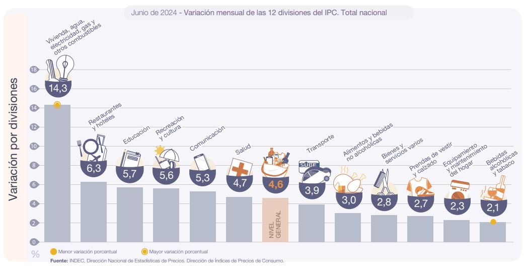 El rubro "vivienda, agua, electricidad, gas y otros combustibles" fue el impulsor principal de la inflación con un incremento del 14,4 %. A continuación se ubicaron los segmentos "Restaurantes y hoteles" con un 6,3; Educación con un 5,7%; Recreación y Cultura con un 5,6 % y Comunicaciones con un 5,3 %. El índice de variación interanual nacional quedó ubicado en 271,5 % y la inflación acumulado en 2024 en 79,8 %. Cabe acotar que para la región patagónica estos valores fueron más altos situándose en 276,9 y 81,7 % respectivamente; en tanto que la inflación de junio para la región fue del 5 %.Visitas: 132014