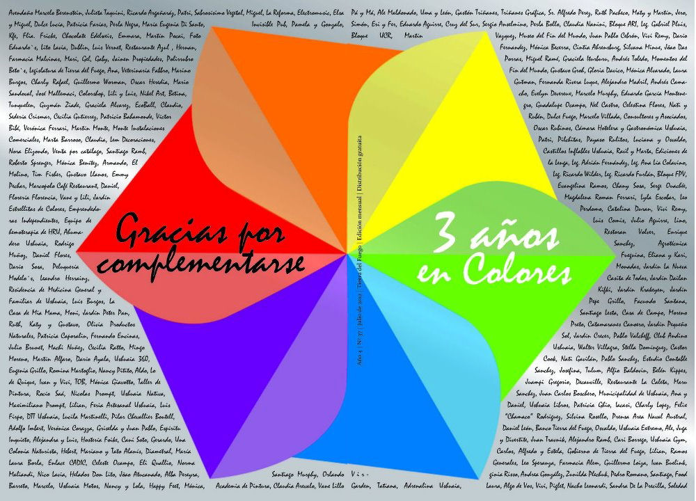 Las hermanas Eugenia y Claudia Pacheco son las editoras, dos mujeres unidas no solo por la sangre sino también por la pasión de dar a conocer a "esa gente que ama este lugar y que no es noticia", con la intención de darle "una oportunidad a las bondades del ser humano", mostrar su "lado luminoso" en medio de tanto trajÃn coyuntural. Y vaya que han tenido éxito en esta cruzada, Colores Complementarios ya es una sana costumbre mensual que ha superado los tres años de vida con su número 37 publicado este mes de Julio. En entrevista con Eugenia Pacheco, supimos que Colores Complementarios fue tomando forma poco a poco, en charlas familiares, "amamos el lugar" confiesa Eugenia y la revista fue una forma de agradecer a Ushuaia por lo brindado. El concepto editorial estuvo claro desde un principio, pero el nombre tardó en llegar; fue Eugenia quién logró bautizarlo al elegir Colores Complementarios, pensando en la analogÃa con la tarea de quienes aportan desde su trabajo y su pasión a crear y fomentar la cultura y sociedad fueguina. En este número aniversario, las editoras se ocupan desde la tapa de agradecer a una infinidad de colaboradores y gente que se sumó y apoyó al proyecto; partiendo desde aquel 7 de Julio en que la revista fue presentada en sociedad en el Museo del Fin del Mundo a instancias de su director MartÃn Vazquez. Colores Complementarios es una publicación de distribución gratuita y se consigue mensualmente en todos los bares del centro, en los museos de la ciudad, en el hospital y los centros periféricos, en las farmacias y también en los locales de todos los auspiciantes. Colores Complementarios también llega a RÃo Grande y Tolhuin.Visitas: 16154