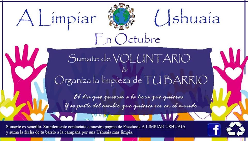 Bajo el nombre "A limpiar Ushuaia", una fanpage en la red social invita a los vecinos a sumarse "el día que quieras, a la hora que quieras" y propone "ofrecete de voluntario para organizar tu barrio y realizar una limpieza, para que todos disfrutemos de una ciudad más limpia" y concluye "entre todos podemos hacer la diferencia". La intención es trabajar durante el mes aniversario de la ciudad. La campaña fue lanzada por Maia Muriel y ya obtuvo el apoyo de numerosos vecinos e inclusive de la Asociación de Guías Profesionales de Turismo que adelantará su primera acción de limpieza al Domingo 25 de Septiembre desde las 16:00 hs. en la Plazoleta Perito Moreno. Entre los compromisos ya registrados de distintos vecinos que se sumaron a la iniciativa hay acciones programadas en el Mirador de La Colina, el Mirador de la Ruta 3 de Centro Hípico, en el arroyo Buena Esperanza, en el Rio Pipo y en los barrios Bosque del Faldeo, Del Bosque, Ecológico, Intevu XIII y Tierra de Leyendas.Visitas: 11308