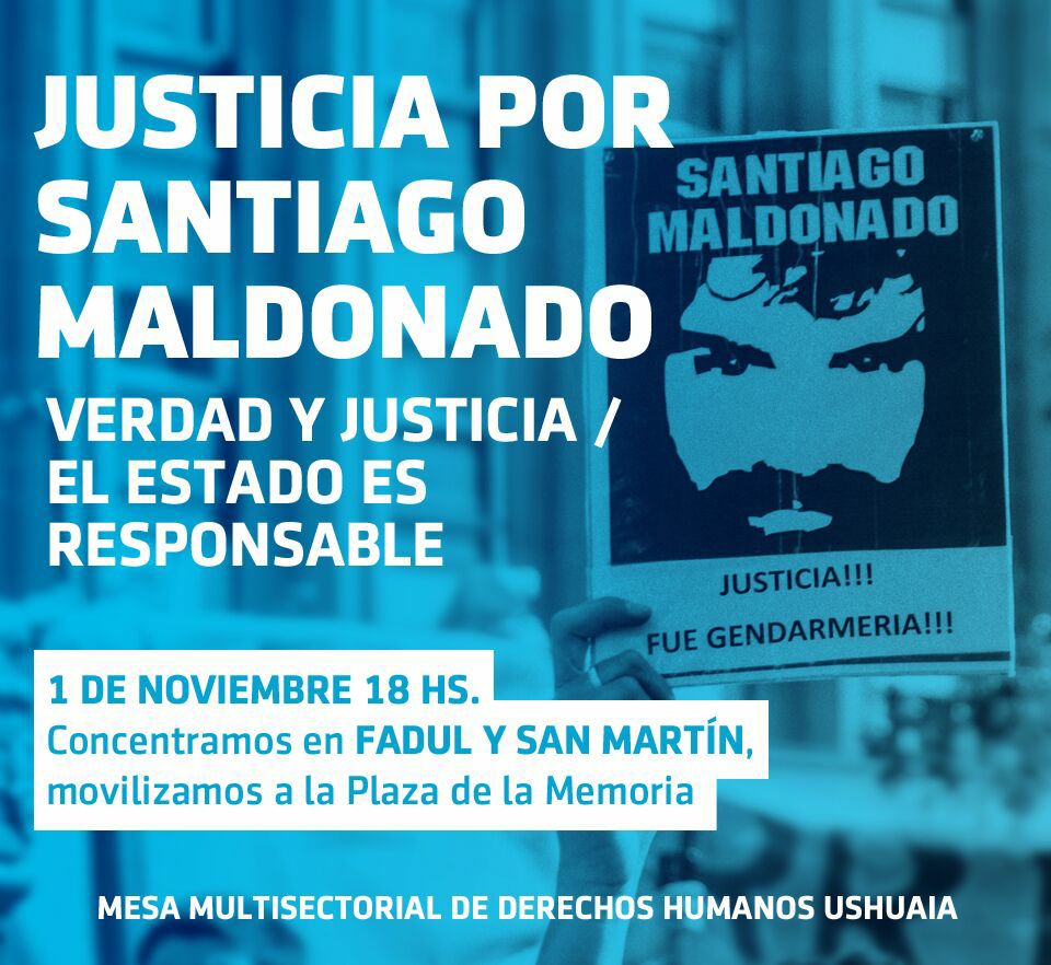 01/11/2017 - La Mesa Multisectorial de Derechos Humanos que se encuentra en formación en Ushuaia, convoca para este miércoles 1° de Noviembre de 2017 a una marcha en reclamo de verdad y justicia por Santiago Maldonado.