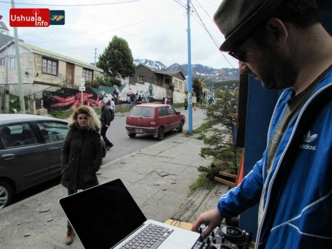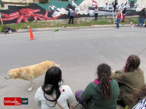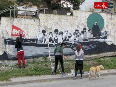 La tarde -gris pero cálida- está siendo musicalizada por Emilio Valencia y contará con la participación de los grupos Mamá Cumbera y Miniplug. En un alto del trabajo, el artista plástico Solguin contó a Ushuaia-Info que la obra retrata la vida de un grupo de pescadores que años atrás tenía un pequeño astillero en lo que hoy es la esquina de Rivadavia y Magallanes. Algunos aspectos de su vida quedaron reflejados en fotografías que los artistas tomaron como base para el diseño del mural. La jornada artística comenzó a las 18:00 hs. y pasadas las 19:00 hs. ya podían divisarse una gran centolla, un grupo de pescadores en un bote y un acordeonista que iban tomando forma sobre el gran muro descascarado que domina la margen Oeste de Rivadavia. Por la noche, cuando caiga el sol, los artistas iban a terminar de transferir sus bocetos a la pared con la ayuda de un proyector. El mural también incorporará una obra del poeta fueguino Julio Leite.