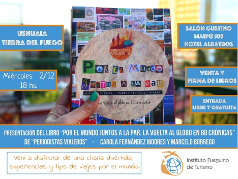 01/12/2015 - El Miércoles 2 de Diciembre de 2015 se realizará en Ushuaia la presentación del libro "Por el mundo juntos a la par. La Vuelta al Globo en 80 Crónicas" escrito por los periodistas viajeros Carola Fernández Moores y Marcelo Borrego.