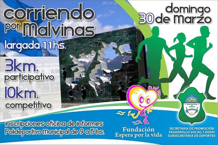 26/03/2014 - El Domingo 30 de Marzo de 2014 se realizará la prueba aeróbica Corriendo por Malvinas con un circuito participativo de 3 km. y uno competitivo de 10 km. Los interesados en participar deben inscribirse en la oficina de informes del Polideportivo Municipal de 09:00 a 15:00 hs.