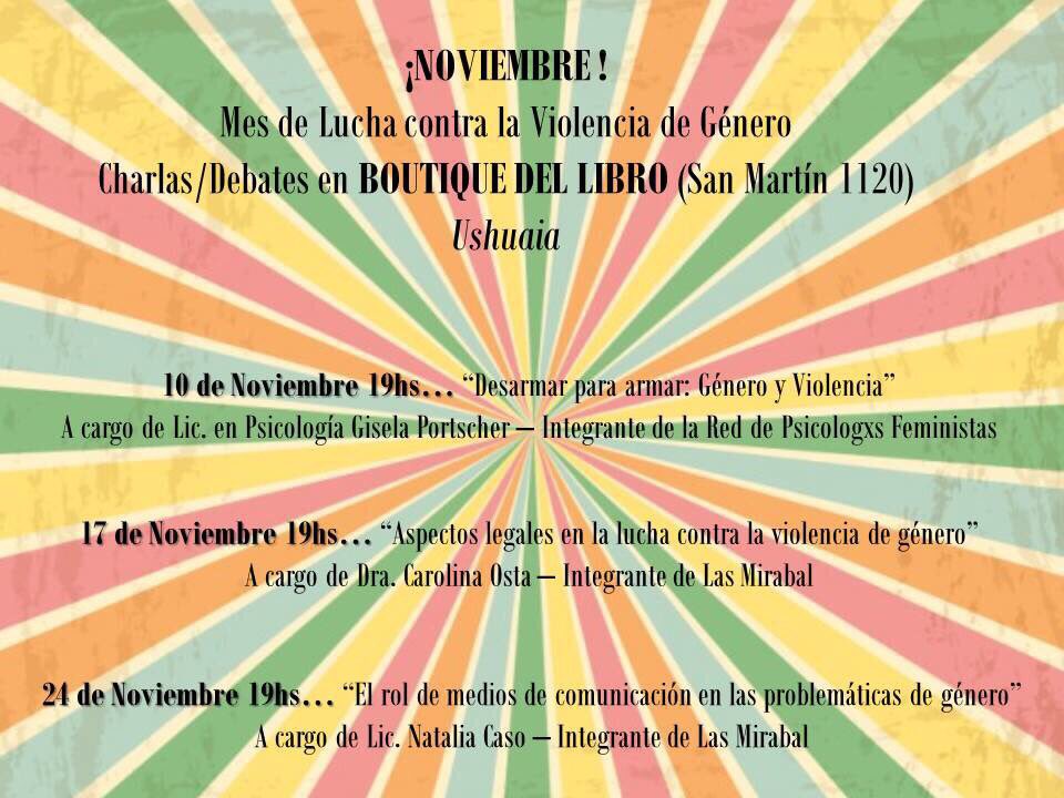 06/11/2017 - Durante el mes de Noviembre se realizará en Ushuaia un ciclo de charlas y debates relacionados a la lucha contra la violencia de género. Los encuentros se realizarán en la Boutique del Libro -San Martín 1120- comenzando el 10 de Noviembre con la presentación "Desarmar para armar: Género y Violencia" a cargo de la Licenciada en Psicología Gisela Portscher -integrante de la Red de Psicólogxs Feministas-.
