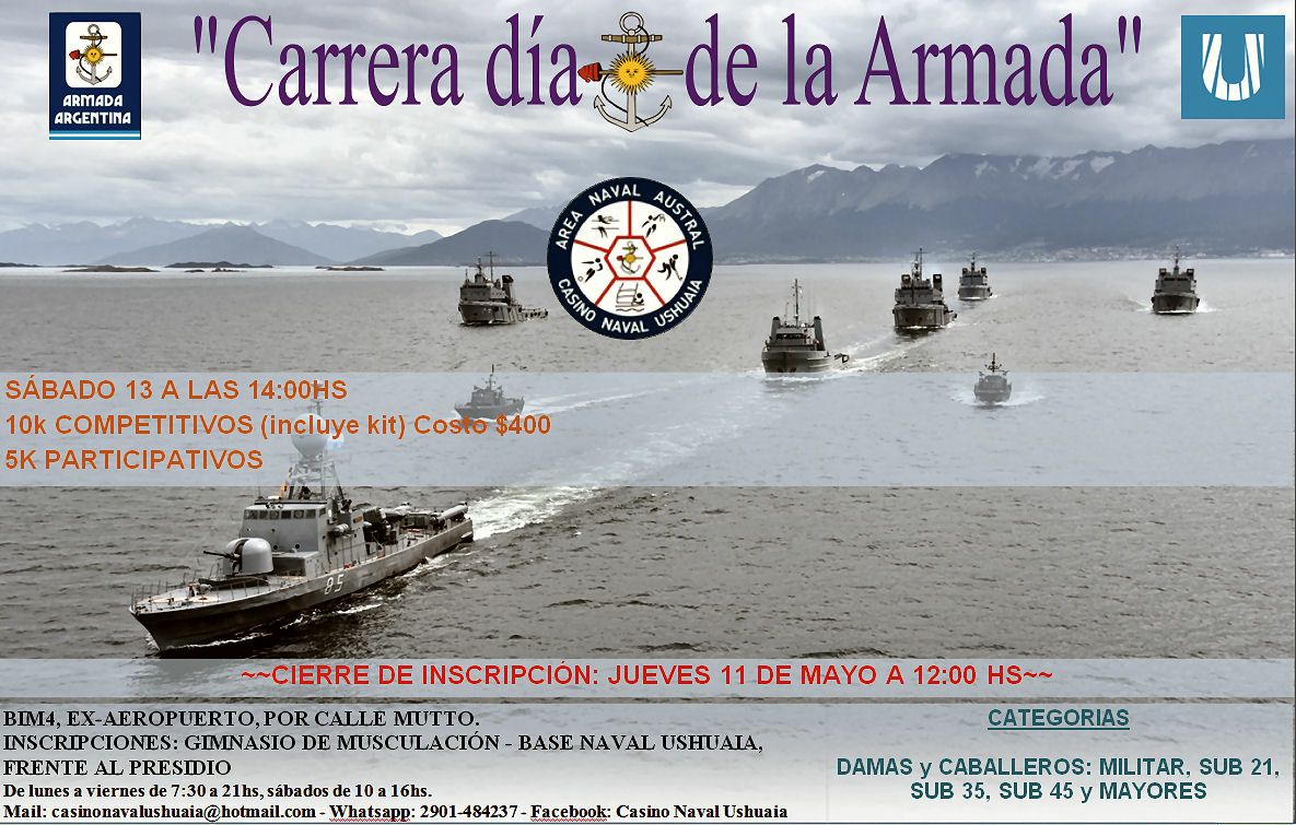 11/05/2017 - El Sábado 13 de Mayo de 2017 se realizará la "Carrera Día de la Armada" organizada por el Área Naval Austral.