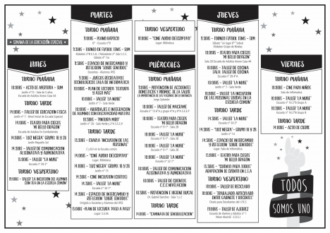 Bajo el lema "Todos somos uno" las jornadas tienen una amplia agenda de actividades que darán inicio el Lunes 5 con el acto de apertura a las 10:00 hs. en el SUM de la escuela. Durante la semana se desarrollarán talleres de educación física, habrá obras de teatro para ciegos, espectáculos de luz negra, talleres de comunicación alternativa y aumentativa, torneos de fútbol 5, espacios de intercambio y reflexión y juegos recreativos entre otras actividades. La agenda