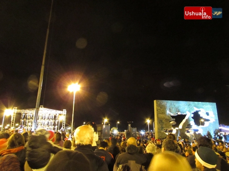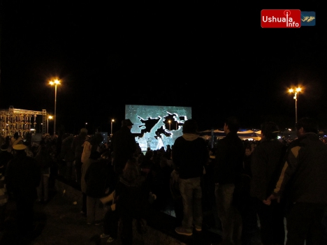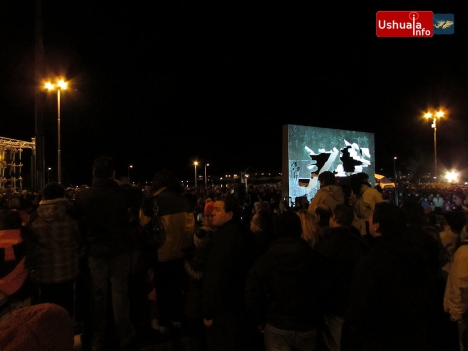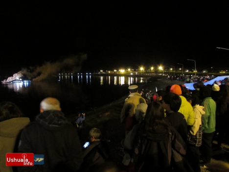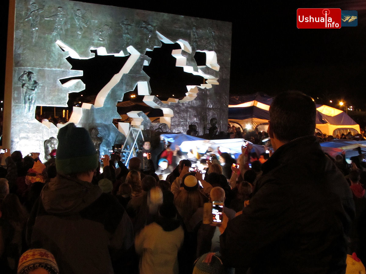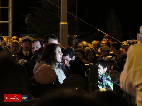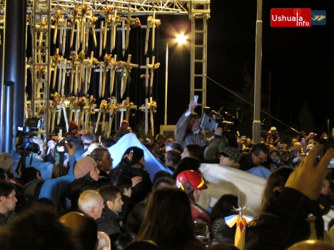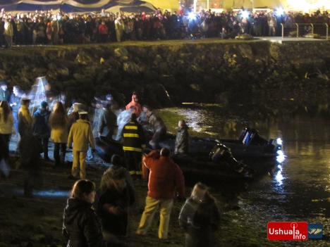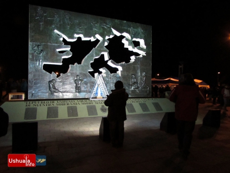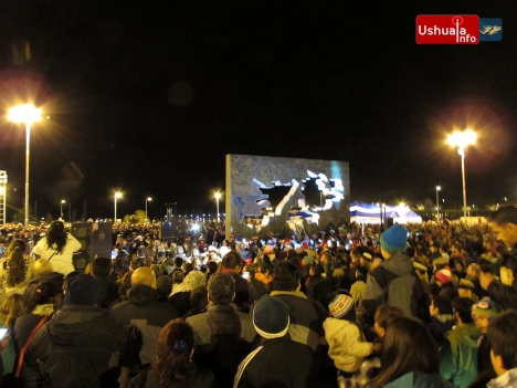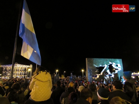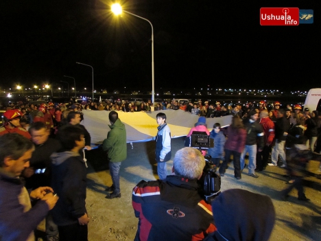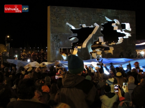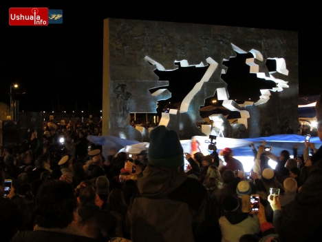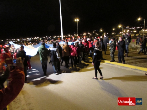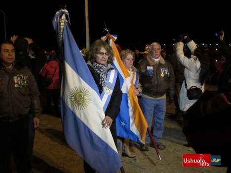 Alrededor de las 23:30 hs. una gran cantidad de público se acercó a la Bahía Ushuaia en la zona de la Pasarela Luis Pedro Fique para recibir a los ex combatientes que arribaron en un kayak y dos botes neumáticos en un simulacro de la recuperación de las Islas Malvinas aquel 2 de Abril de 1982. En la costa los esperaba un nutrido grupo de hijos y familiares de ex-combatientes que en esta vigilia tomarán la posta de la conmemoración. Desde la costa y escoltados por una guardia de honor integrada por boy scouts y bomberos; los familiares llevaron desplegado el nuevo pabellón nacional hasta el mástil