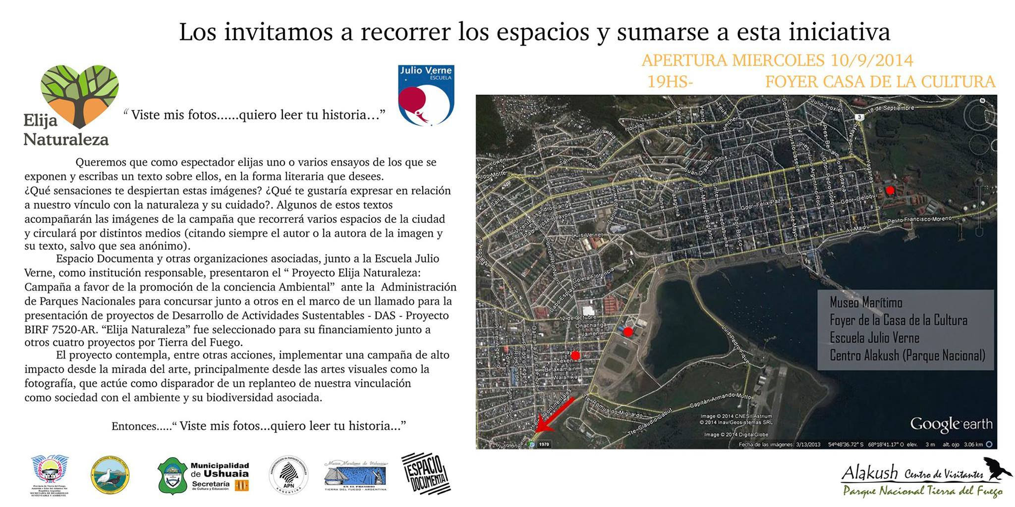 El Proyecto Elija Naturaleza tiene el lema "Viste mis fotos...quiero leer tu historia..." y propone que el espectador de la imágen exprese por escrito sus sensaciones sobre lo que observa, luego algunos de los textos -citando autor de la imágen y del texto- acompañarán a las imágenes en un recorrido que realizará por la ciudad. Participan fotógrafos que expondrán en distintos lugares , ellos son María Paz Muriel, Vivtor Bibé, Julio Márquez, Gustavo Consentino y Fernanda Rivera Luque en el Foyer de la Casa de la Cultura; Gabriela Cammertoni, Facundo Santana y Cynthia Cordi lo harán en Alakush; por su parte Analía Rivero, Malala Lekander, Mercedes Hileman y Juan Barrera lo harán en el Hall del Museo Marítimo de Ushuaia y Daniela Galvan, Silvia Gigli, Ricardo Sinner y Ernesto Cordoba en la Escuela Julio Verne. Los organizadores invitan a participar con la consigna "Queremos que como espectador elijas uno o varios ensayos de los que se exponen y escribas un texto sobre ellos, en la forma literaria que desees". La iniciativa es llevada adelante por el Grupo Espacio Documenta, organizaciones asociadas y la Escuela Julio Verne que presentaron el proyecto ante la Administración de Parques Nacionales en el marco de la presentación de proyectos de Desarrollo de Actividades Sustentables -DAS-, Elija Naturaleza resultó seleccionado para su financiamiento.Visitas: 8991