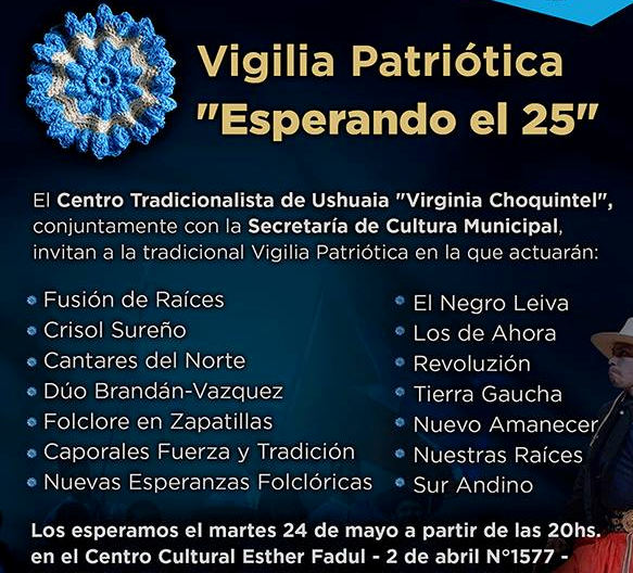 La vigilia patriótica se realizará esta noche en el Centro Cultural Esther Fadul. Organiza el Centro Tradicionalista de Ushuaia "Virginia Choquintel".