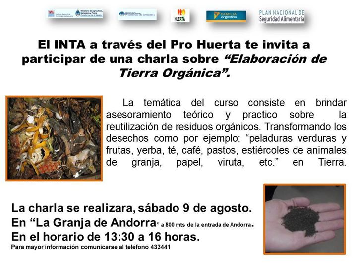 La temática se refiere a la reutilización de residuos orgánicos. La charla se realizará en la GRanja de Andorra el Sábado 9 de Agosto de 2014. La actividad está promovida por el INTA a través del programa Pro Huerta.