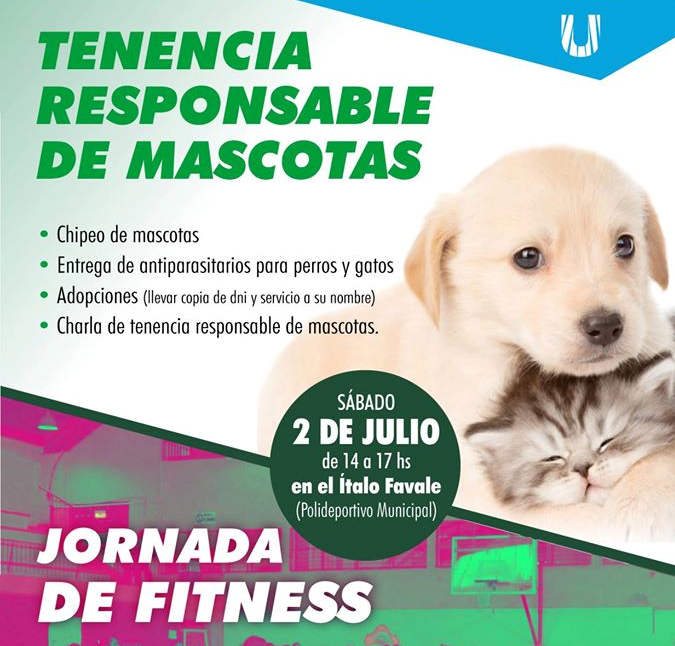 En la jornada estarán presentes mascotas en adopción, a la espera de una familia responsable. Además se realizará el chipeado de canes y se estará entregando antiparasitarios para perros y gatos. Cabe señalar que para adoptar una mascota es requisito ser mayor de 18 años, llevar DNI y fotocopia del mismo y una copia de algún servicio a su nombre. También se podrá participar de las clases de Zumba, Body Combat, Body Attack y de Ritmos, que se llevarán a cabo en la cancha 4 del Gimnasio Hugo Ítalo Favale de 14:00 a 17:00 hs. Entre clase y clase la Doctora Garber, Directora de Zoonosis, brindará consejos sobre tenencia responsable de mascotas.Visitas: 7743