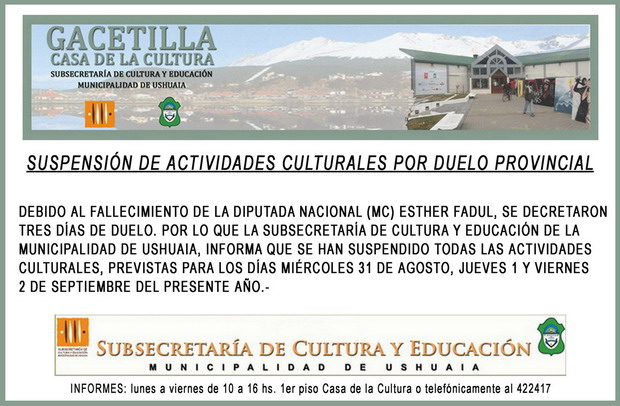 31/08/2011 - La SubsecretarÃa de Cultura y Educación de la Municipalidad de Ushuaia informó que debido al fallecimiento de la Diputada Nacional (MC) Esther Fadul se decretaron tres dÃas de duelo. En consecuencia se han suspendido todas las actividades culturales, previstas para los dÃas Miércoles 31 de Agosto , Jueves 1º y Viernes 2 de Septiembre del presente año.